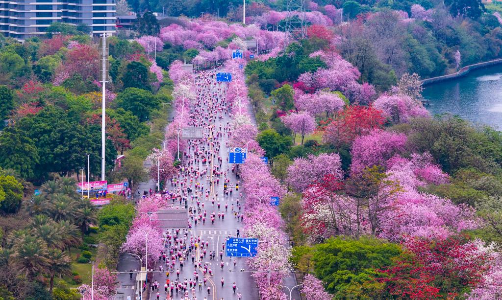 来自全国各地的跑者在广西柳州开满洋紫荆花的沿江赛道上奔跑。新华社发(黎寒池 摄)