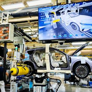 长江之畔,武汉经济技术开发区。东风岚图汽车工厂总装车间里,底盘安装机器人精准作业,人工智能视觉检测系统实时监控装配工序,数字程序被快速刷写进智能模块……生产线上,多款新能源车型混流前行,平均每63秒就有一台新车下线。
