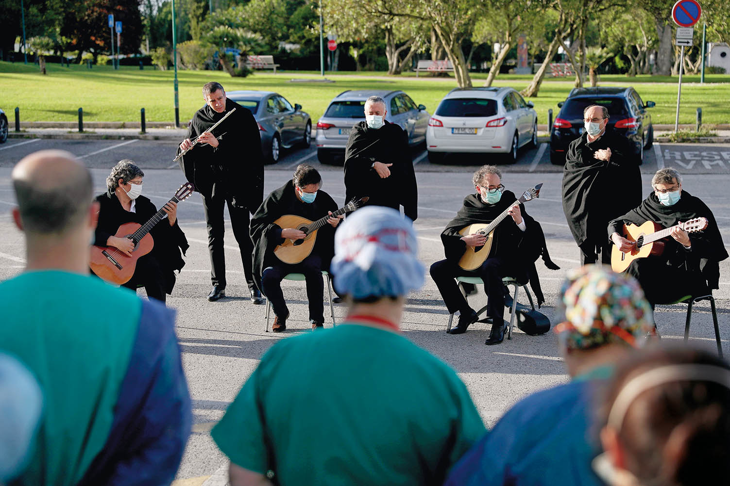 2020 年 5 月 12 日,“法朵”音乐表演团队“月光小夜曲”来到葡萄牙首都里斯本的圣玛利亚医院,为医护人员表演“法朵”乐曲