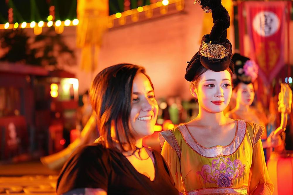 在西安永宁门,玻利维亚诗人杰西卡·弗罗伊登塔尔与一位“唐代仕女”合影(中国作家协会供图)