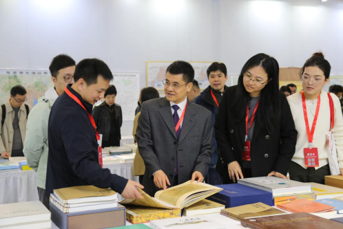 图为在第二届中国测绘地理信息大会上林振中(中)向嘉宾介绍地图出版物。(程浩然 摄)