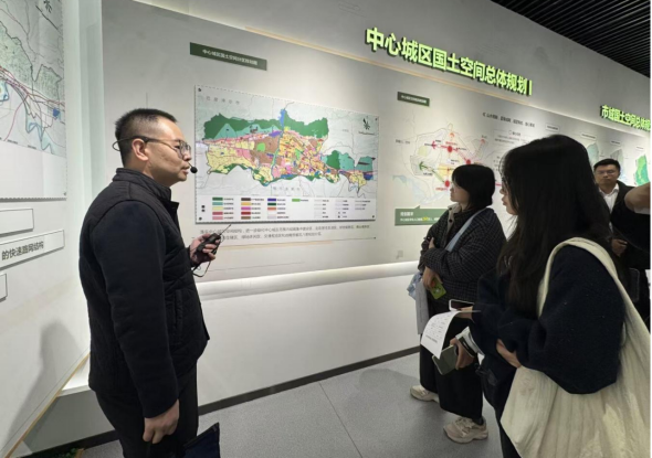 工作人员向采访团介绍将活动断层避让要求纳入中心城区国土空间总体规划有关情况。新华网发