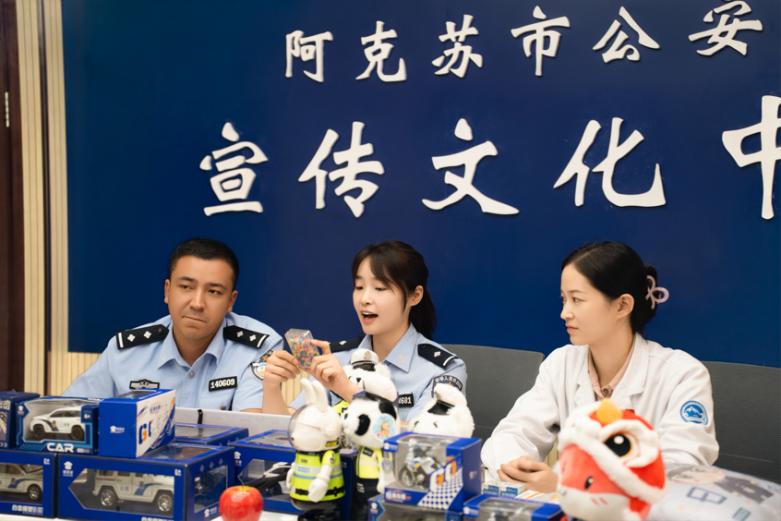 图为龚鑫钰联合市局公安文化宣传中心、市人民医院开展禁毒宣传直播活动。阿克苏市公安局供图