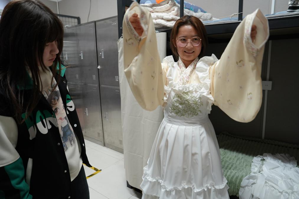 李星在和同学试穿汉服。新华社记者郭圻 摄