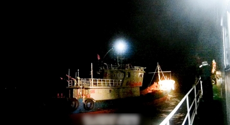 一切的源头要追溯到2025年4月29日的深夜,浙江三门附近海域,浙江台州海警局执法艇在该海域巡逻时,发现一艘无船名船号且非法改装的渔船,正借着夜色悄然航行。更不寻常的是,船体吃水异常深,船舷几乎贴近海面,这一反常迹象瞬间引起了海警执法员的高度注意
