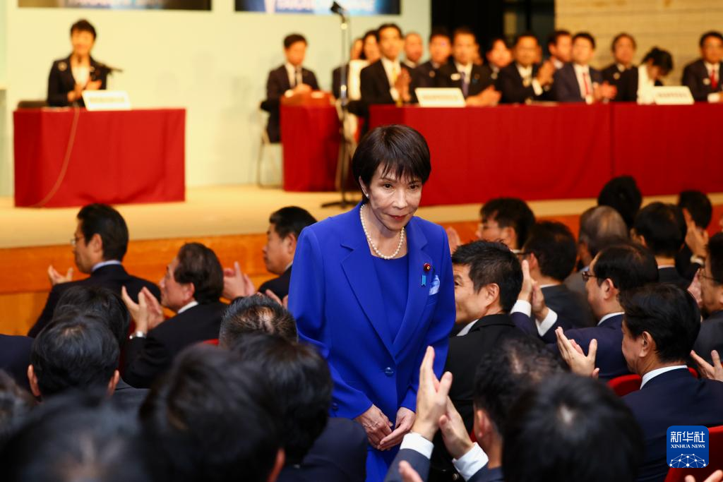 10月4日,在日本东京的自民党总部,高市早苗(中)在自民党总裁选举中胜出后接受祝贺。