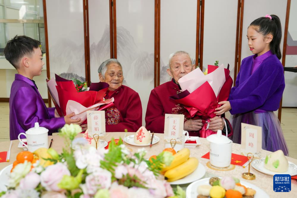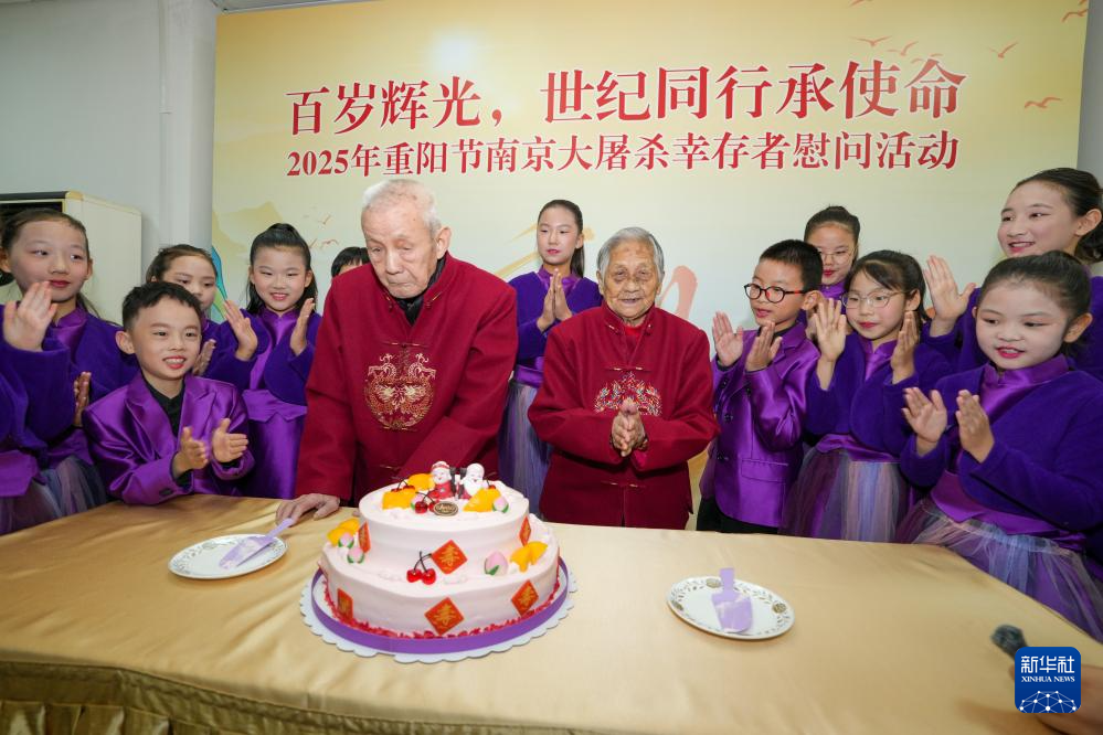 10月29日,侵华日军南京大屠杀遇难同胞纪念馆邀请两位南京大屠杀幸存者王义隆(前右)和薛玉娟(前左)共度重阳节。