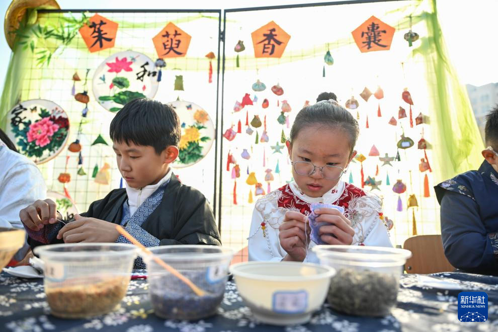 10月29日,内蒙古鄂尔多斯市伊金霍洛旗第四小学学生在制作茱萸香囊。
