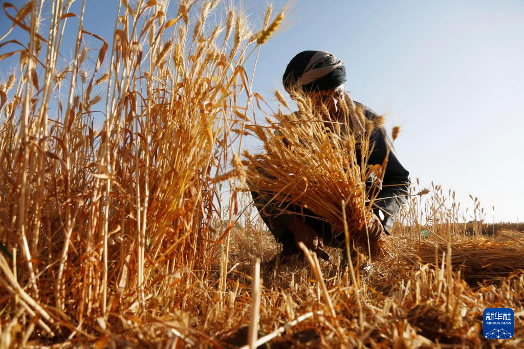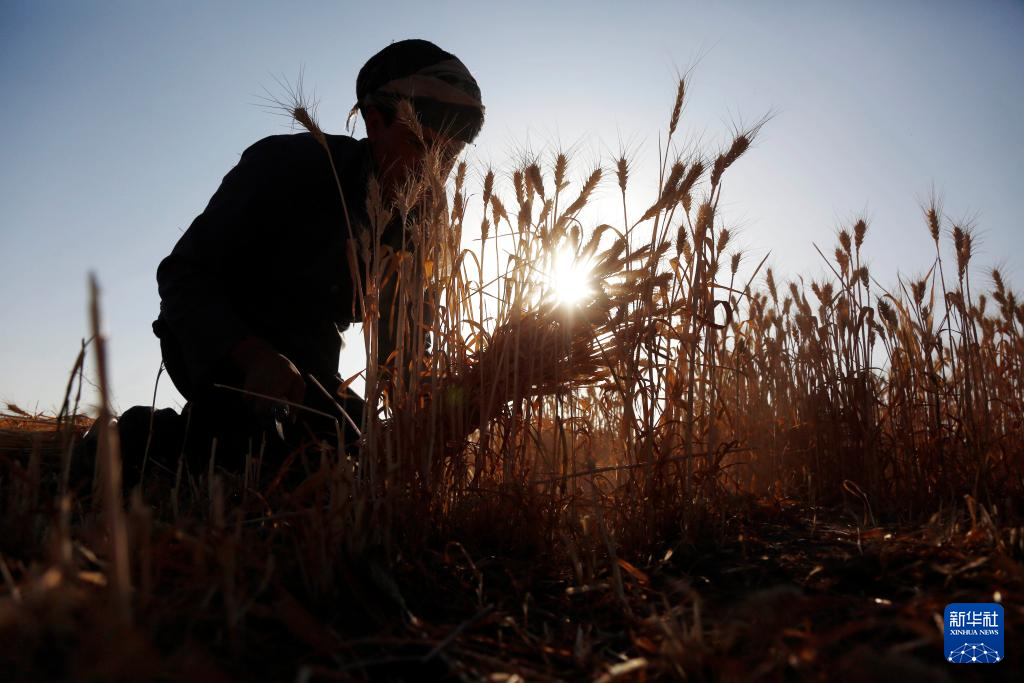 近日,也门萨那郊区的小麦农场迎来收割季。