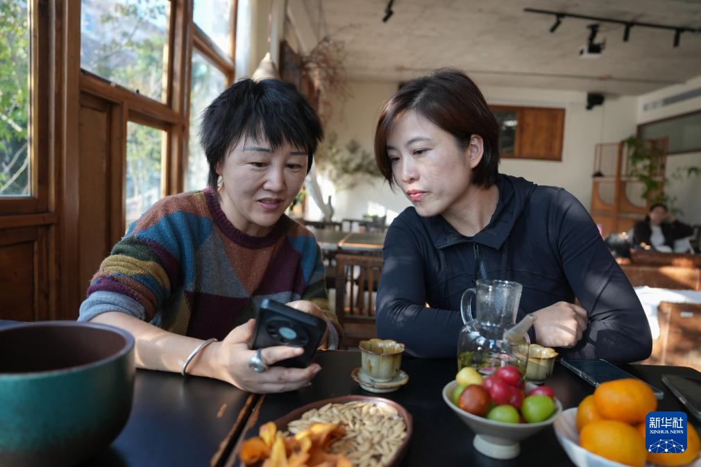 11月13日,民宿主徐小风(左)与董凤洁在一起讨论次日的游客接待安排。
