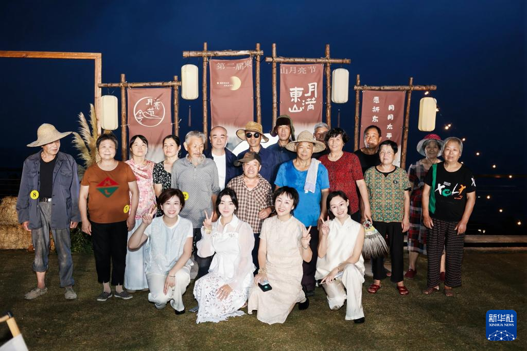 10月7日,东山村民宿主徐小风(前右二)、董凤洁(前左一)与徐娜(前右一)在共同发起与村民联欢的“月亮节”上与村民代表合影。