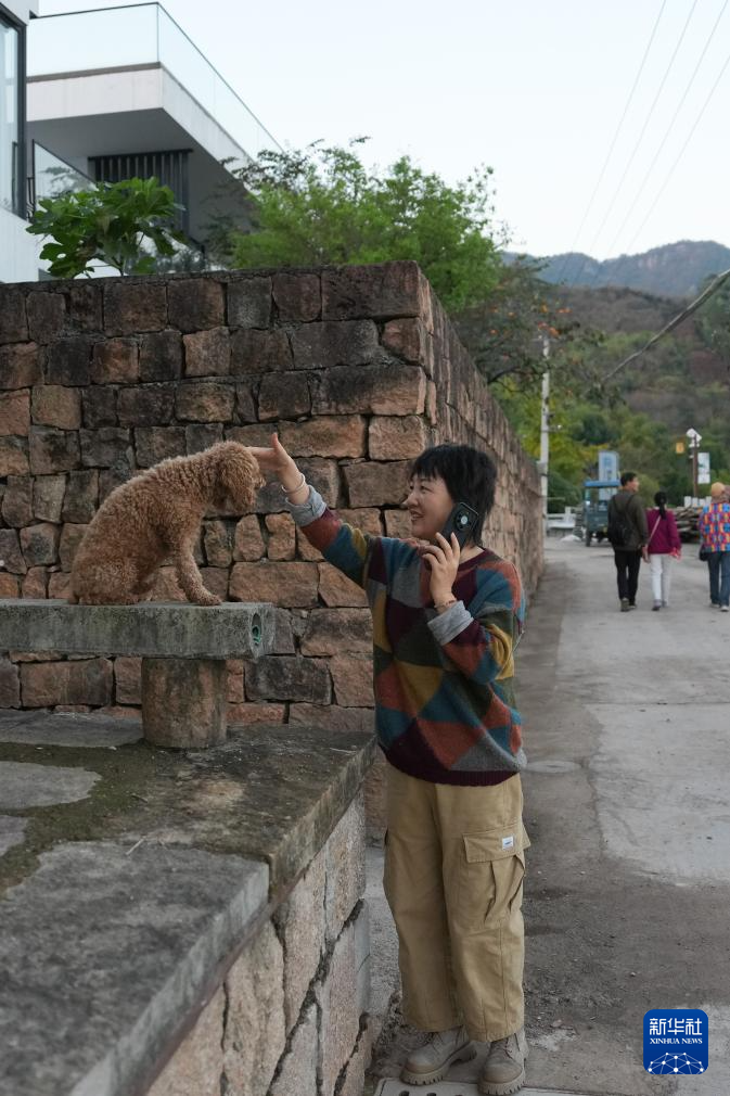 11月13日,东山村民宿主徐小风在村里闲逛时与小狗互动。2019年起,徐小风扎根外婆的老宅,经营着“花庭·东山上”民宿,是村里民宿业的第一批“拓荒者”。