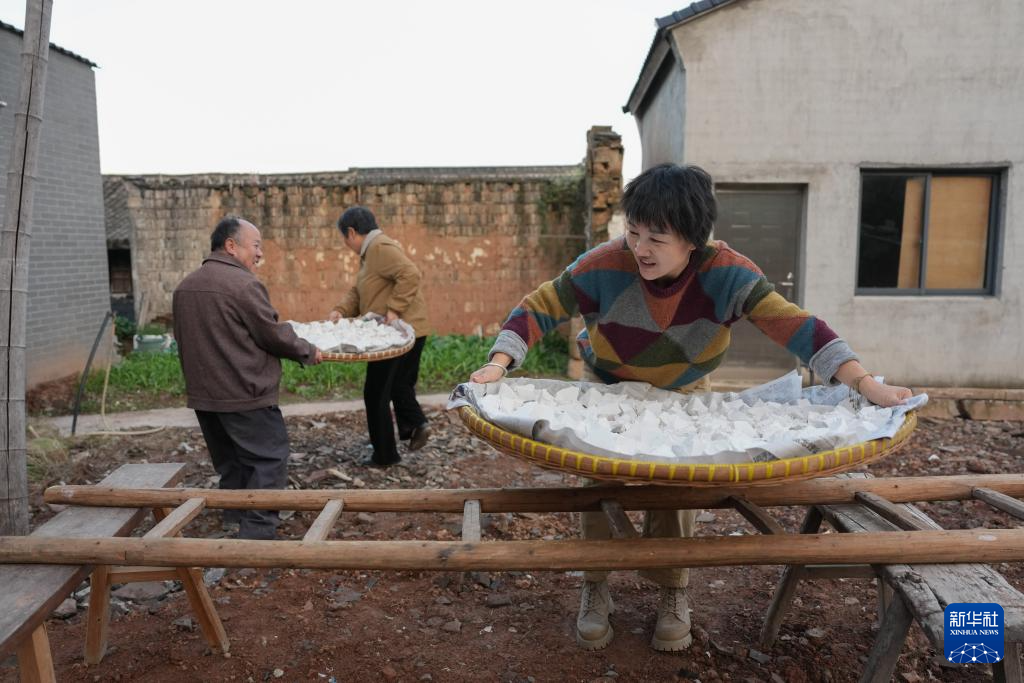 11月13日,东山村民宿主徐小风(右)帮助村民将晾晒的红薯粉搬回家。2019年起,徐小风扎根外婆的老宅,经营着“花庭·东山上”民宿,是村里民宿业的第一批“拓荒者”。