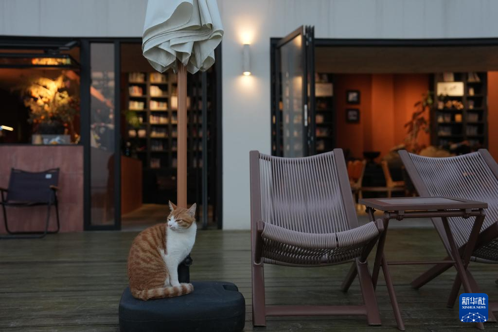 11月13日拍摄的东山村“一览”咖啡馆里的猫。2021年,民宿主徐娜辞去幼师工作返乡创业,并开办“一览”咖啡馆,吸引大批游客来村里打卡。
