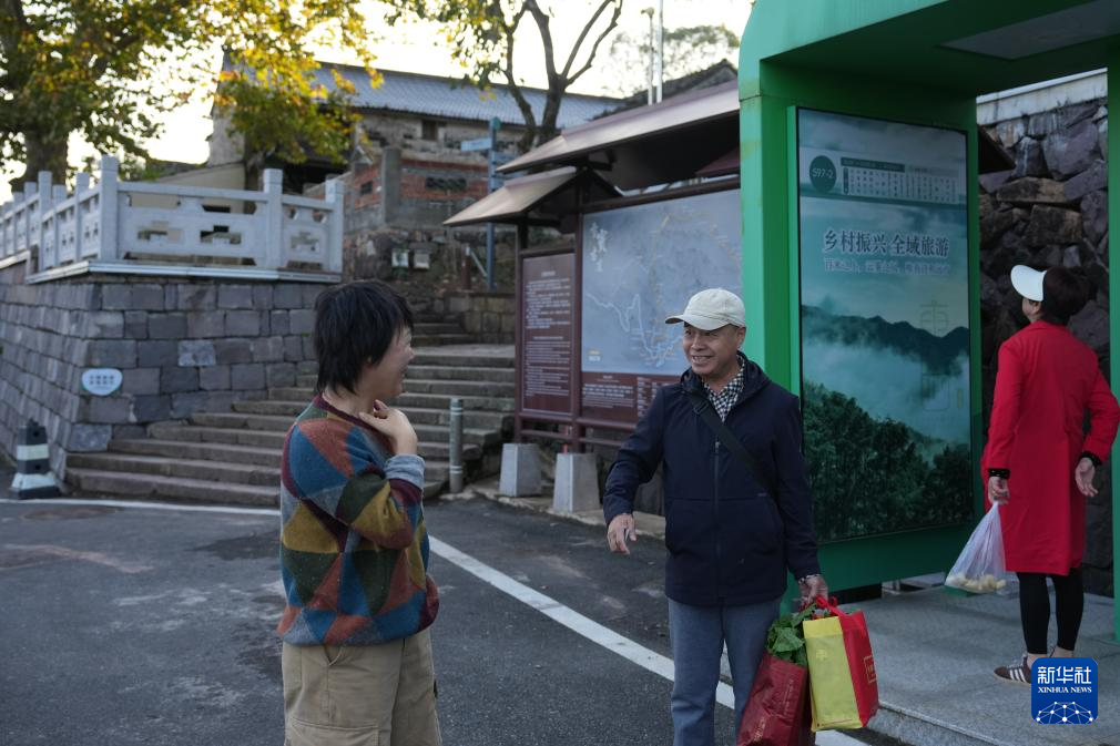 11月13日,东山村民宿主徐小风(左)与村民聊天。2019年起,徐小风扎根外婆的老宅,经营着“花庭·东山上”民宿,是村里民宿业的第一批“拓荒者”。