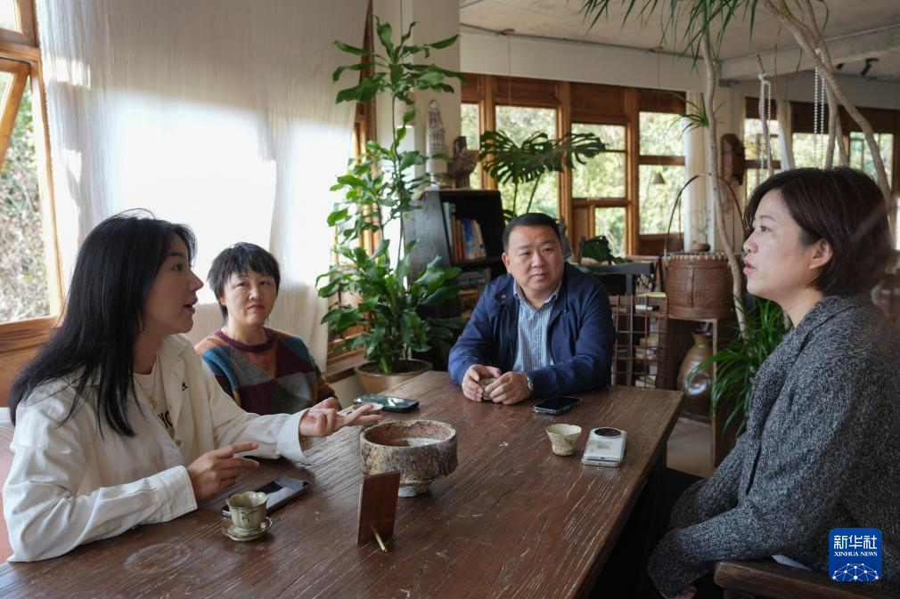 11月14日,民宿主徐小风(左二)、董凤洁(右一)与东山村党支部书记、村委会主任徐佩伦(右二)、东山村乡村CEO胡亮玉(左一)在一起讨论民宿及文旅综合体项目发展。
