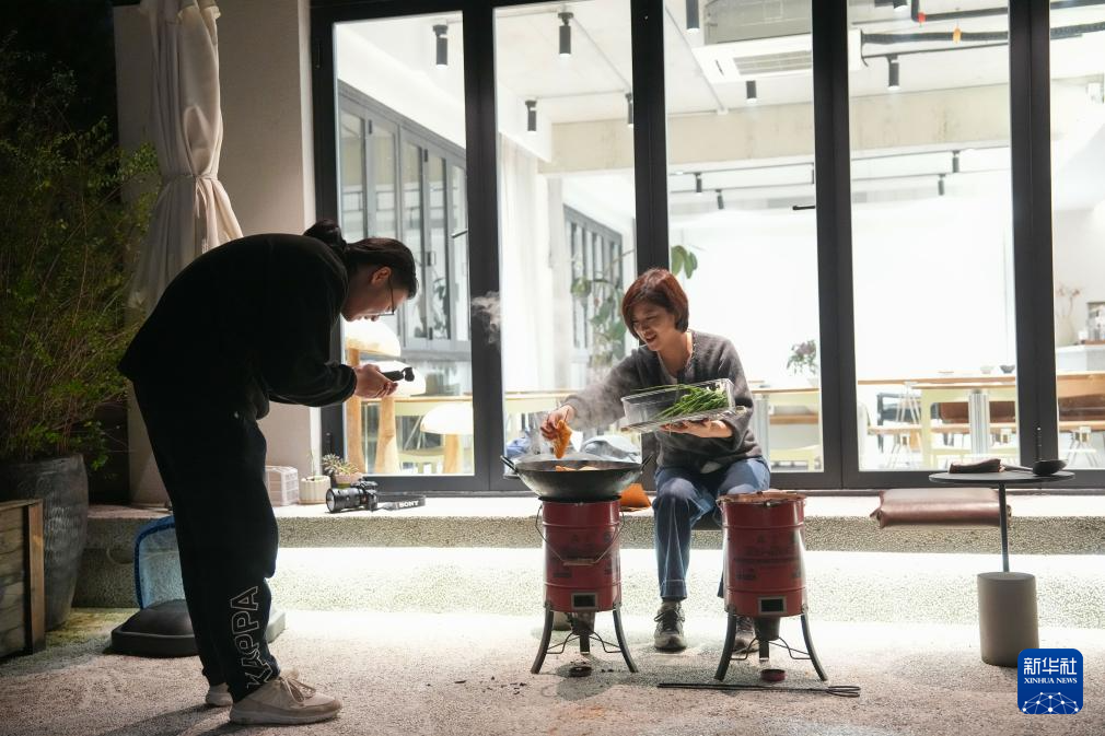 11月13日,东山村民宿主董凤洁(右)在民宿内拍摄炒年糕的短视频。2024年5月,董凤洁打造的“东山禄房”民宿正式营业。她坚持拍摄短视频,推介村里的美景、美食。