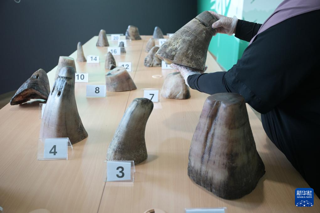 11月18日,一名国家公园局工作人员在新加坡野生动植物法证中心向媒体展示查获的犀牛角。