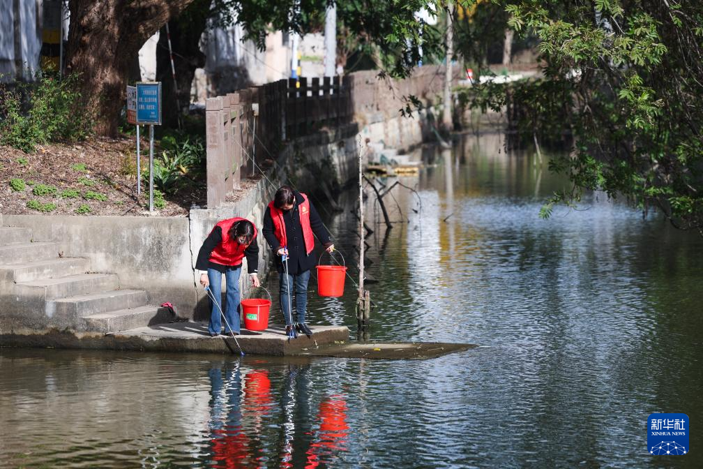 11月25日,和平镇长城村党员志愿者在河岸旁清理漂浮物。