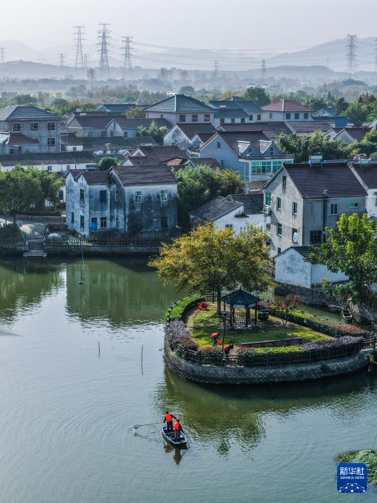11月25日,和平镇长城村保洁人员乘船打捞水面漂浮物(无人机照片)。
