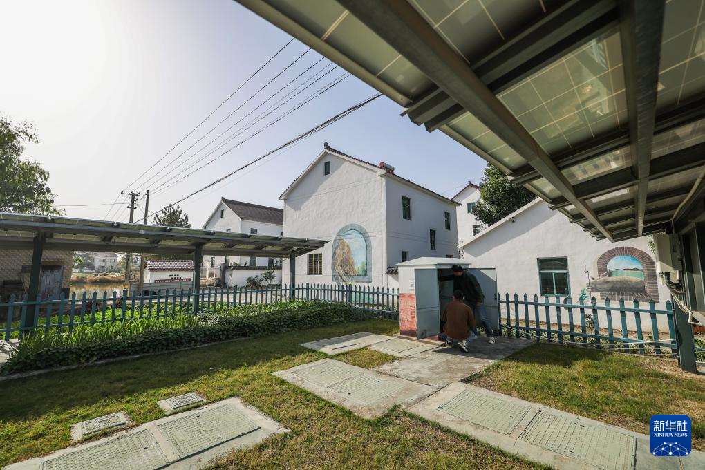 11月25日,工作人员在巡查和平镇长城村生活污水处理设施,该设施用太阳能光伏设备收集的电能处理生活污水。