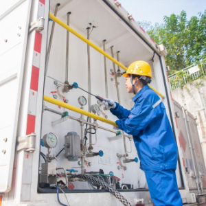 11月26日,综合加能站工作人员在氢燃料管束车氢燃料接卸作业前进行安全检查。