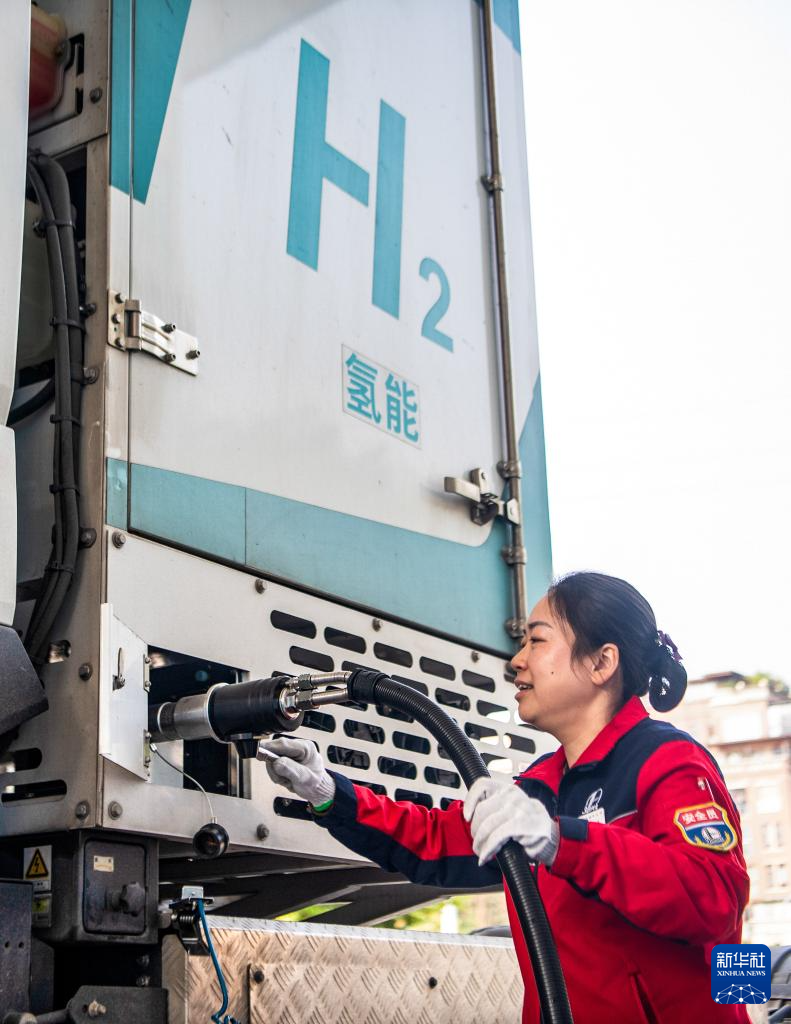 11月26日,综合加能站工作人员在为氢燃料电池汽车加注氢燃料。