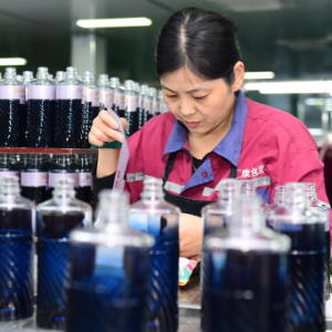 11月27日,在郓城县丁里长街道烟郓科技产业园,工作人员为酒瓶贴花。