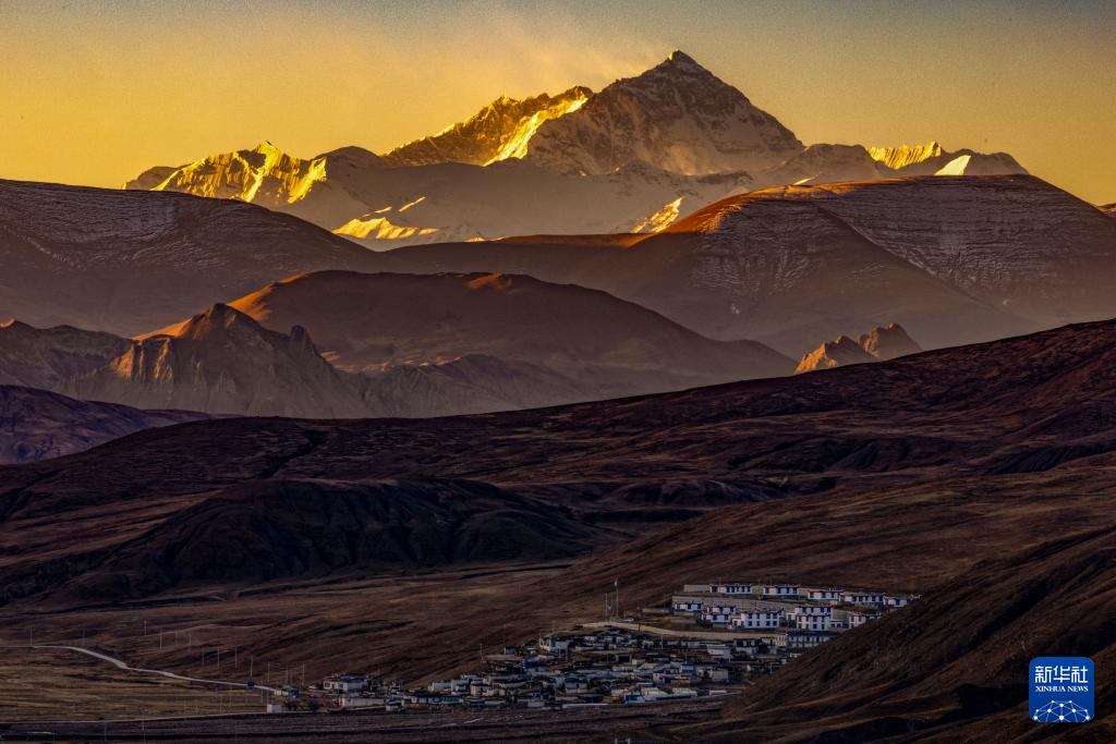 进入冬季,珠峰脚下西藏定日地震灾区重建的2.2万余户民房和维修加固的1.05万余户房屋已全部交付使用,群众陆续搬入新居温暖过冬。这是11月13日日出时分拍摄的西藏定日县协格尔镇查那村,村中地势较高处为建成并交付使用的新房。