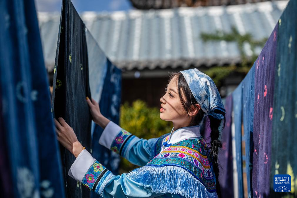 周城,位于大理白族自治州大理市喜洲镇,东临洱海、西枕苍山,是云南省最大的白族自然村,也是著名的“白族扎染之乡”,全村现有扎染经营户200多家,从业人员4000余人。作为大理地区传统手工印染工艺,白族扎染距今已有上千年历史。这是11月21日,一名女子在周城村“璞真染坊”体验晾晒扎染。