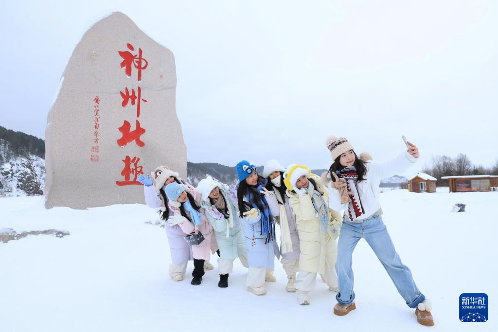 11月22日,游客在漠河北极村“神州北极”碑前打卡拍照。