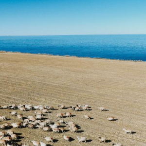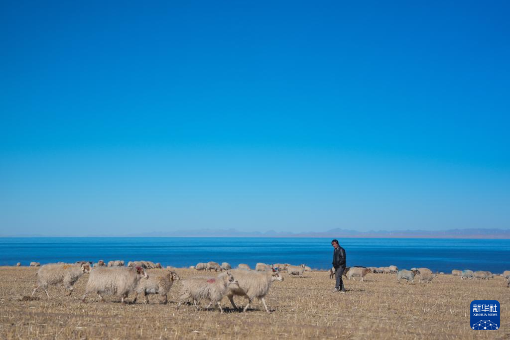 冬日,在青海省海南藏族自治州共和县江西沟镇附近的青海湖湖畔,牧民赶着羊群在这里放牧,湛蓝的湖水与羊群相映成景,绘就一幅冬日牧羊图。