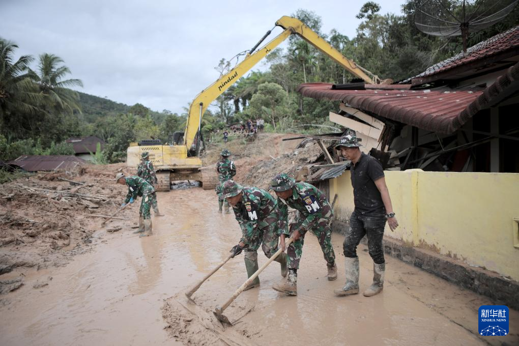 11月28日,在印度尼西亚北苏门答腊省,救援人员清理淤泥。