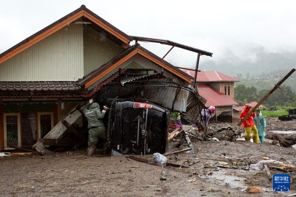 11月28日,在印度尼西亚西苏门答腊省,救援人员在受灾地点工作。