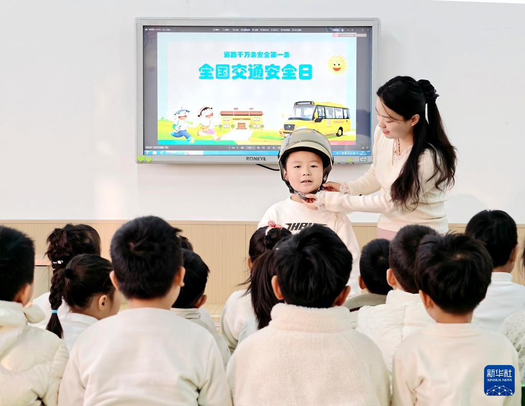 12月2日,在河南省济源市第一幼儿园,老师教孩子们如何正确佩戴头盔。