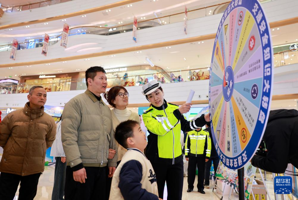12月1日,在江苏泰兴吾悦广场内,交警与市民共同参与交通安全知识大转盘趣味互动。