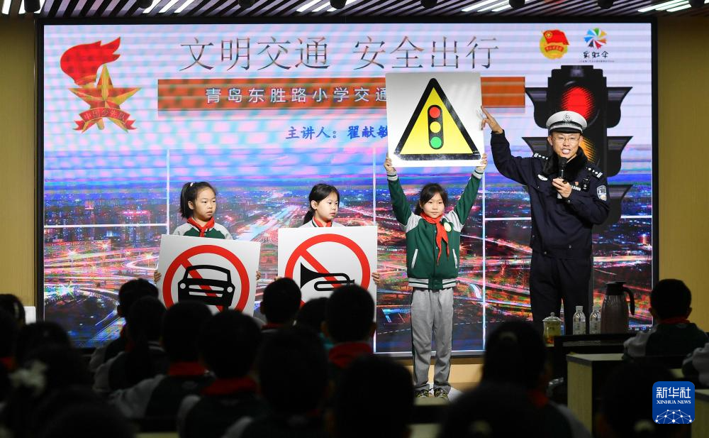 12月2日,在山东省青岛市市北区东胜路小学,交警指导学生学习交通标志。