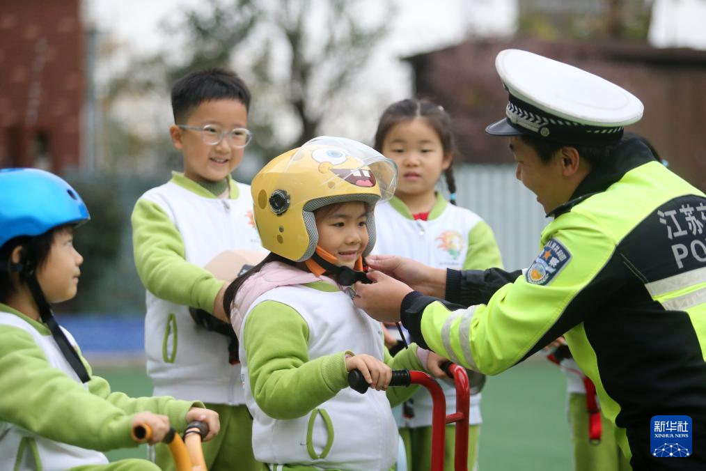 12月2日,在江苏扬州大学附属西郡幼儿园,交警为小朋友讲解如何正确佩戴头盔安全出行。