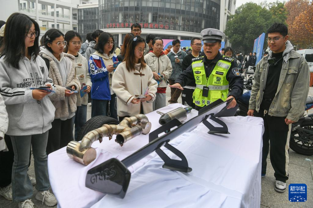 12月2日,浙江省金华职业技术大学校园,一名辅警给学生介绍非法改装车的危害。