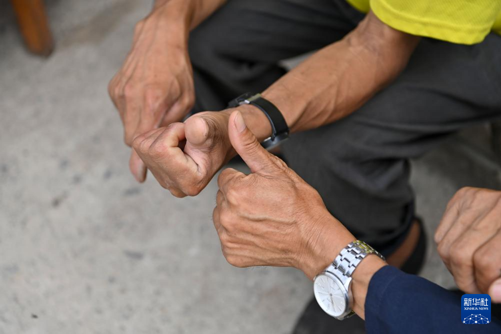 在山西省平顺县东寺头乡小南铺自然村,村民和秦海松(上)通过手势交流(8月6日摄)。