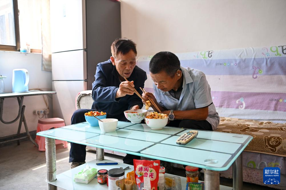在山西省平顺县东寺头乡黄崖沟自然村,村民程娇梅(右)为秦海松准备午饭(10月11日摄)。