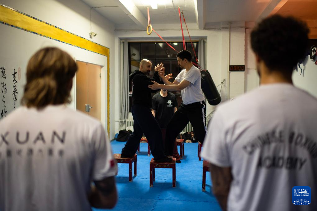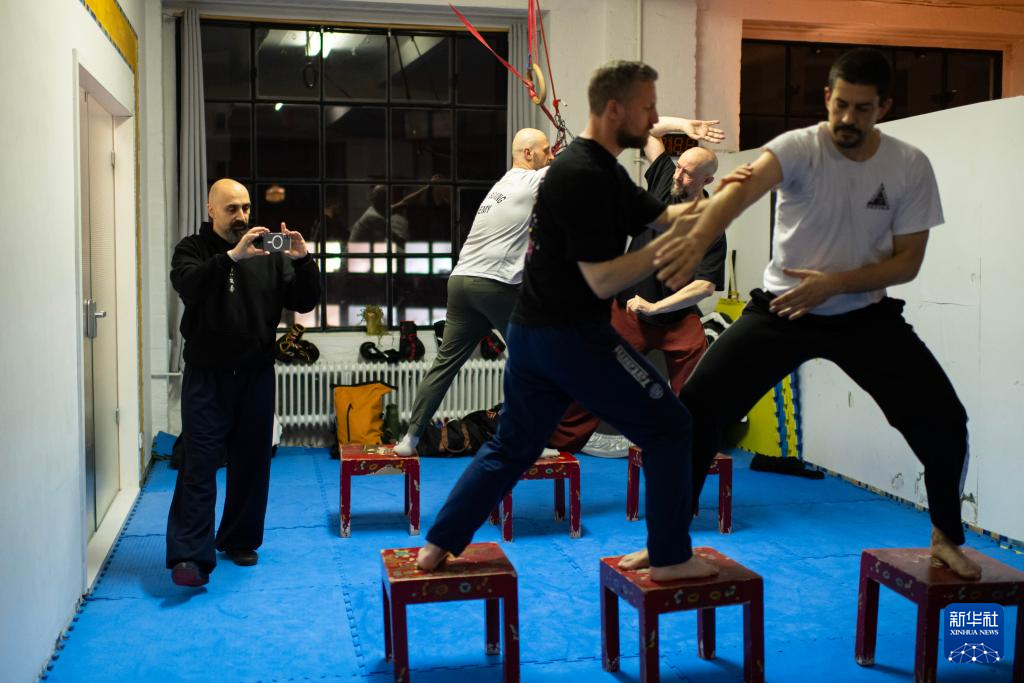 11月13日,学员在德国柏林“玄”武术馆练习武术(镜像)。