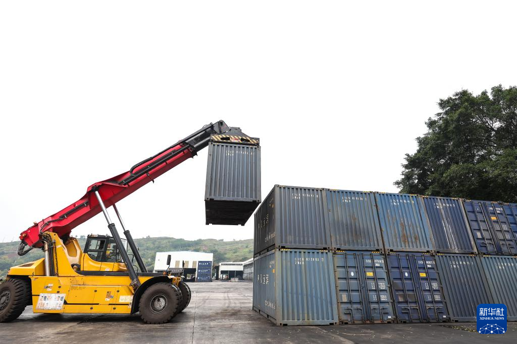 12月3日,在重庆市綦江区三江街道的重庆高速交通安全产业园内,地平面(重庆)供应链有限公司的工作人员搬运货运集装箱。