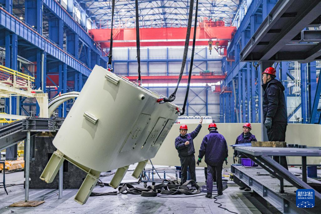 2023年1月13日,工人在位于沈阳市的北方重工有限公司车间吊装设备。