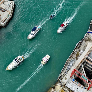 12月5日,游艇从三亚河口通道工程项目上驶过。