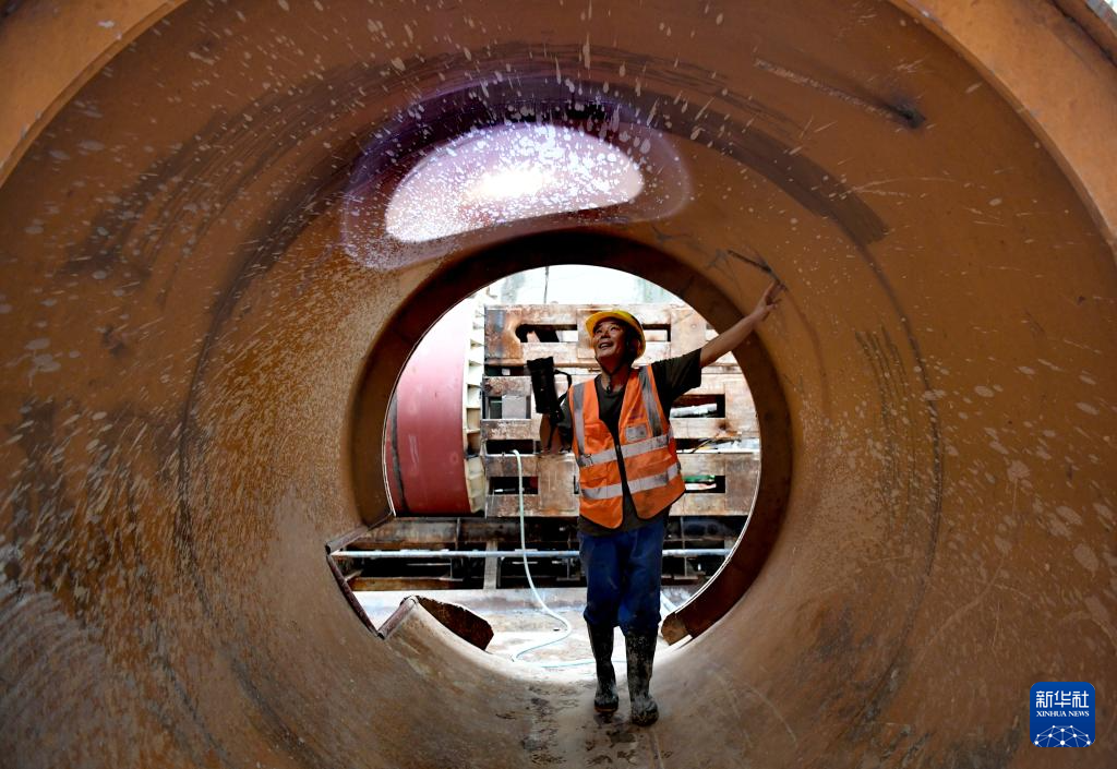 12月5日,工人在三亚河口通道工程项目现场检查贯通管相邻管节状态。