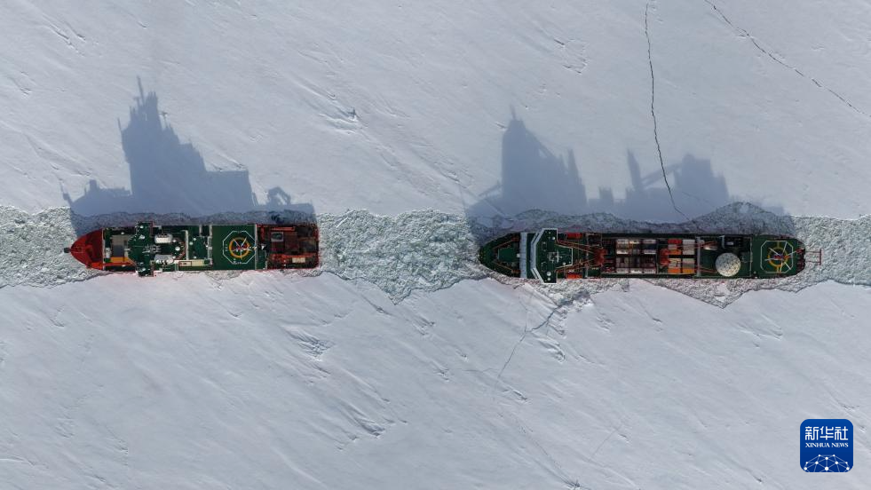 这是“雪龙”号(右)与“雪龙2”号(12月5日摄,无人机照片)。