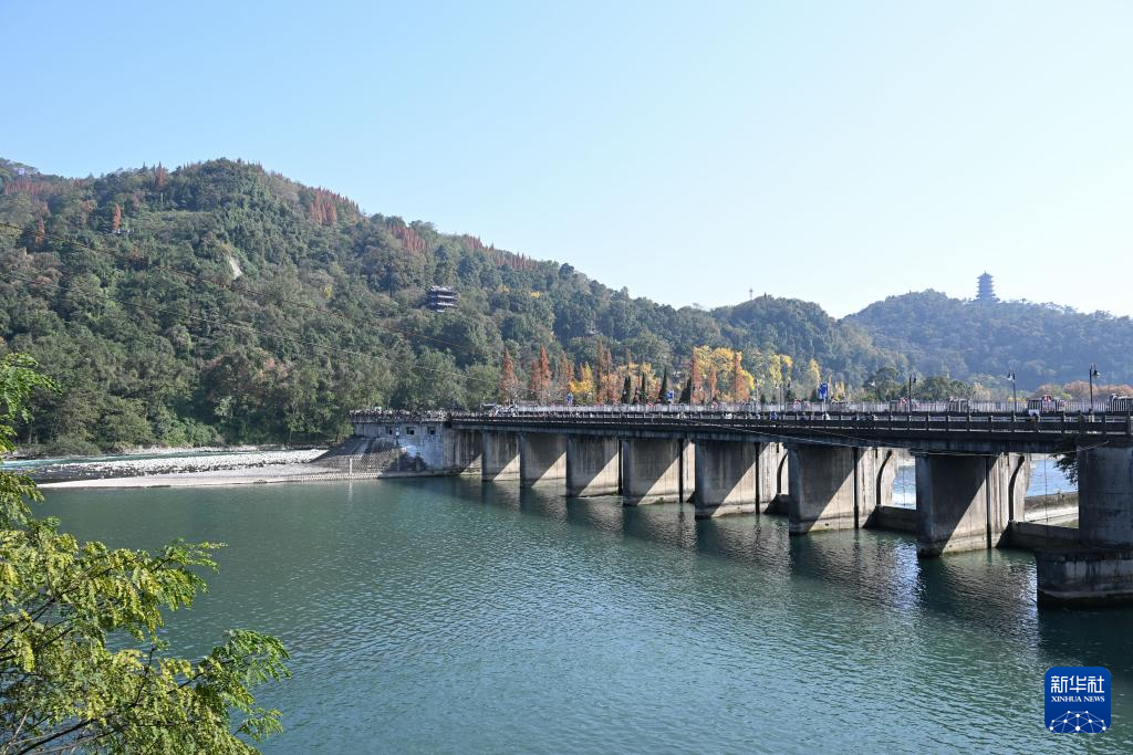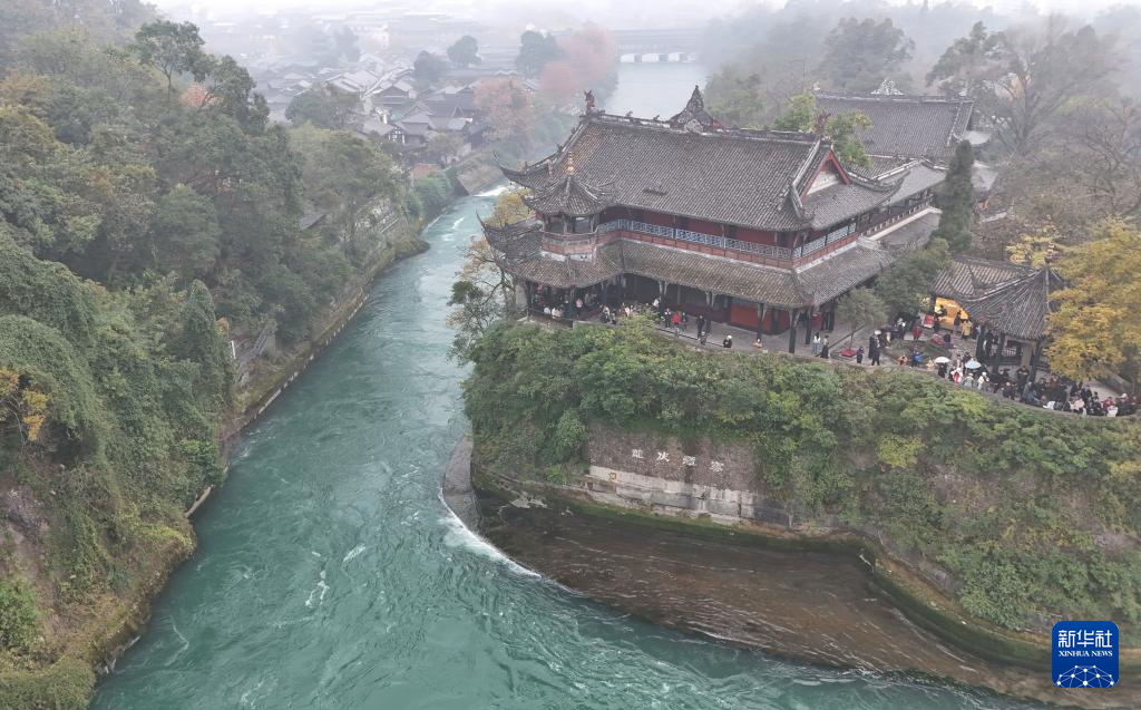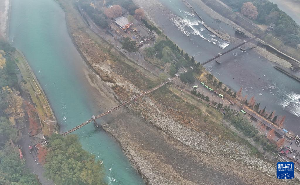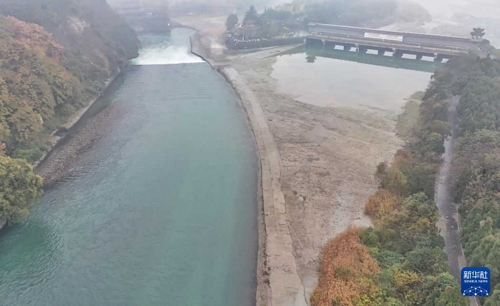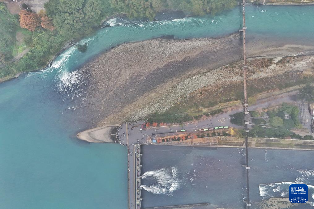 图为内江(左)与飞沙堰(无人机照片,12月6日摄)。飞沙堰是都江堰水利工程三大工程之一,长约200米,高2.15米,其作用是当内江水量较小的时候,拦水进入宝瓶口,起着河堤的作用,保证灌区水量。当洪水季节水量较多时,大量的江水由于受到宝瓶口的阻拦并在此淤积,当超过溢洪道的高度时,多余的水量就自动排泄到外江。