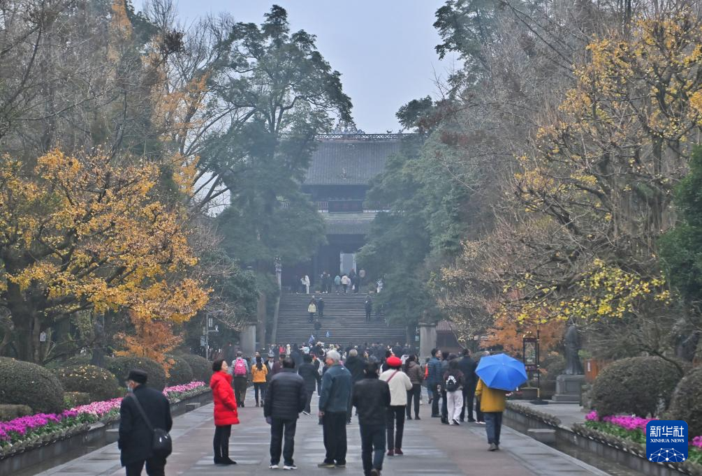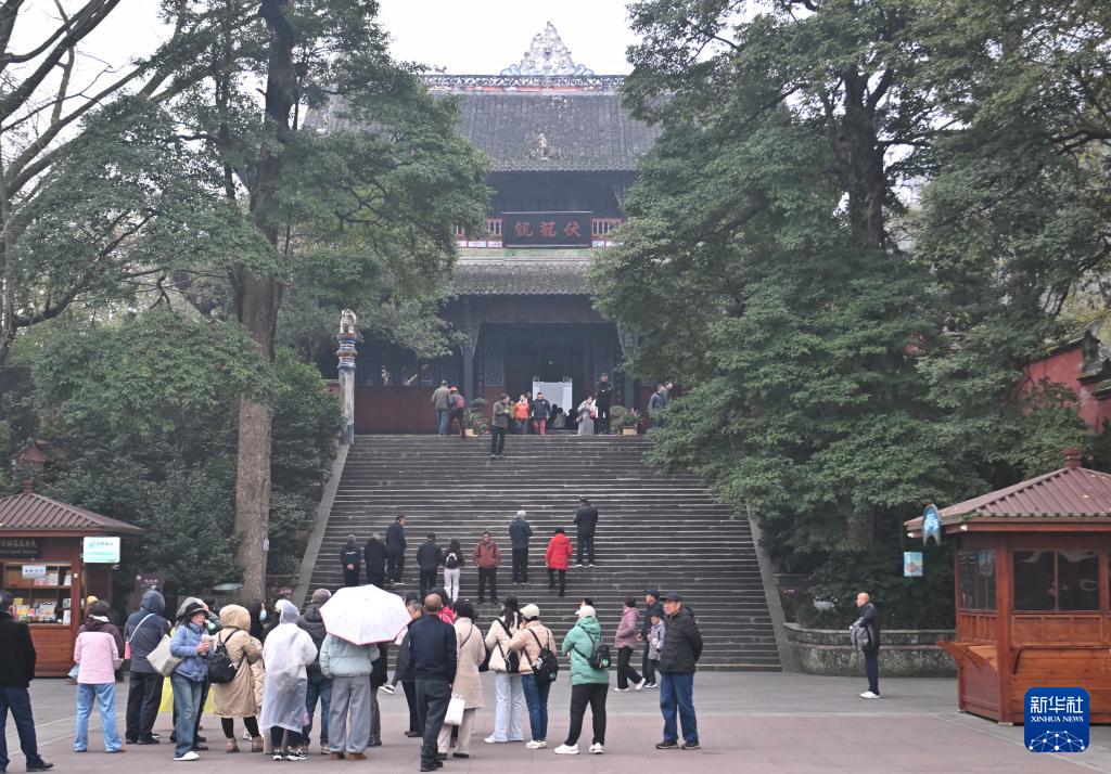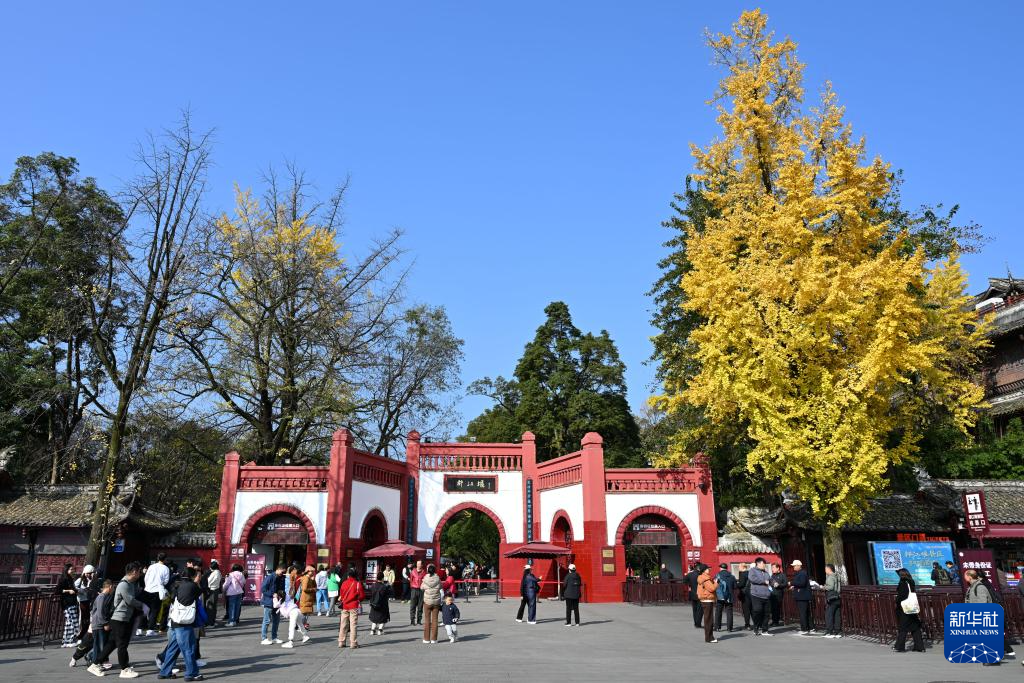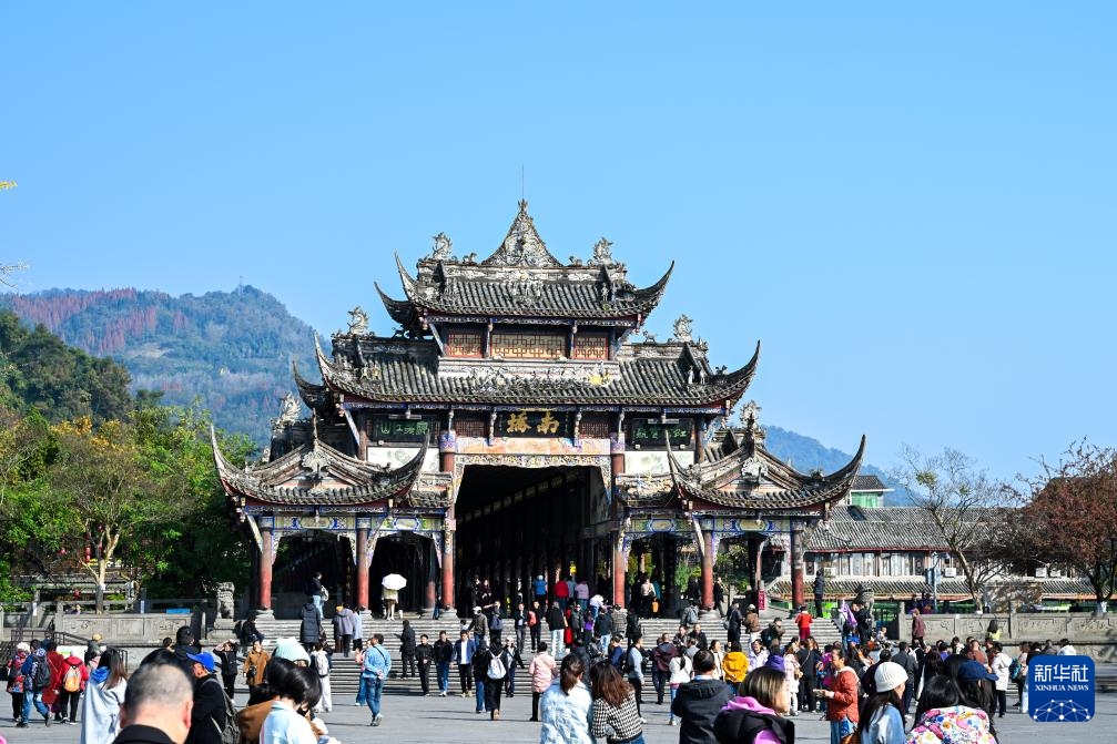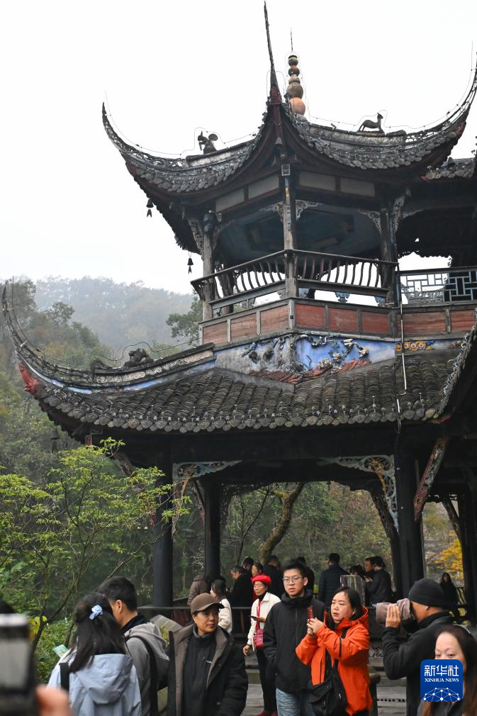 12月6日,游客在伏龙观前游玩。伏龙观前身名叫“范贤馆”,始建于西晋末年。北宋初年,人民缅怀治水英雄李冰父子,大兴土木,扩建殿宇,是历代祭祀李冰治水的主祭之地。