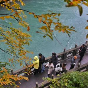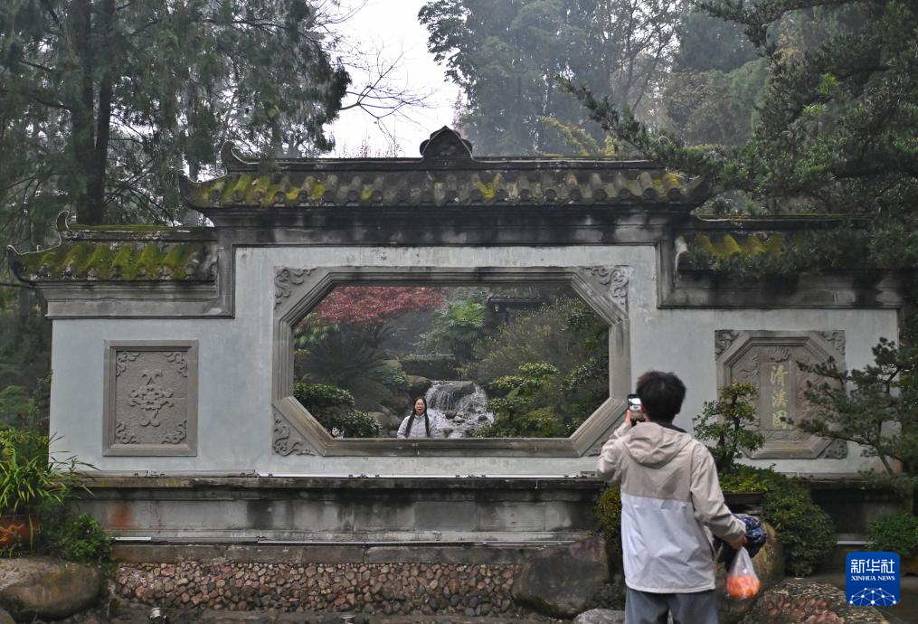 12月6日,游客在都江堰景区内拍照留念。